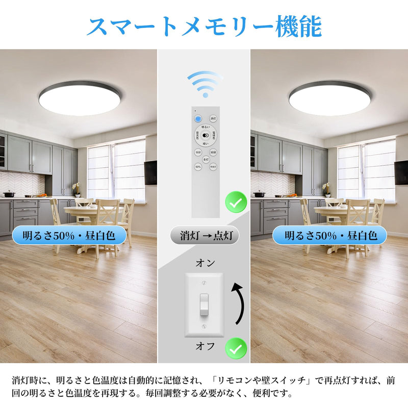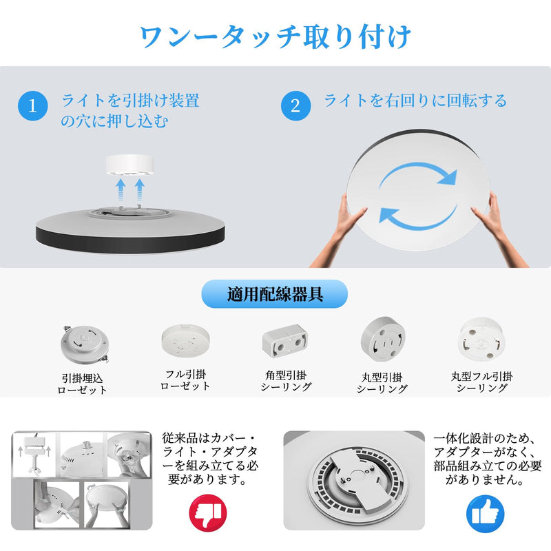 6畳用を試しに購入し、10畳用を2台購入しました。3台で一万円もを切りました。◎評価する点 安価で軽量、設定が記憶されるので、壁スイッチでのOn-Offも問題なし。調光機能も良いです。 某量販ディスカウントD社の独自ブランド(O社製)商品は、初期値が常夜灯で、リモコン操作が必須、壁スイッチで消灯すると初期値に戻ってしまうのでお蔵入り。△工夫が欲しい点 取付が非常に厄介。シーリング蛍光灯のような取付用のパーツが無いので、穴に指すのが致命的に難しい。 我が家は丸形シーリングですので、天井との隙間も少なく、場所を見ながら取り付けることは不可能。 結局、電極パーツと本体を外して(小さな木ねじで回転しないように固定されている。)先に電極パーツをシーリングに取り付け、その跡本体を取り付けました。 これは完全にマイナスポイントです。 また、リモコンはペアリングの必要がありました。スマホのアプリからBluetoothでも使えるとのことなので、仕方無いのかも知れません。