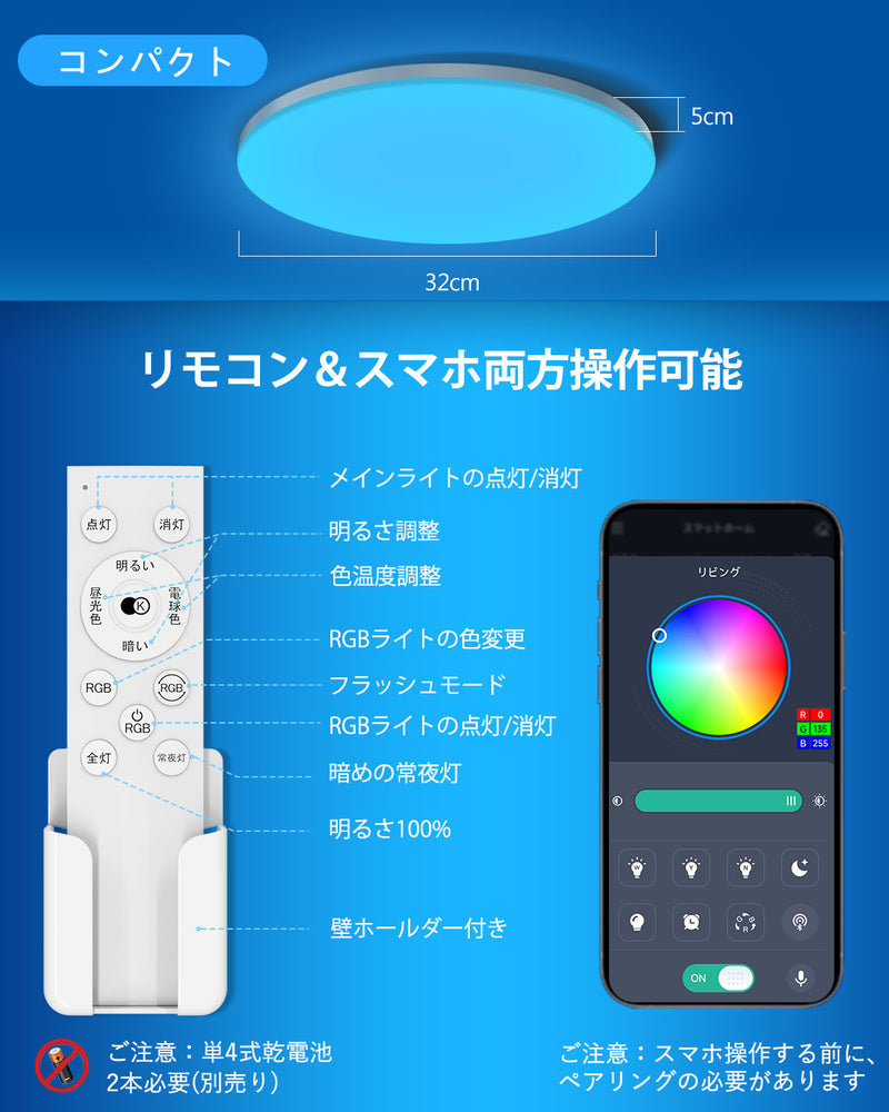 このサイズで大丈夫か?と思いましたが、実際に点灯してみると全く問題ない明るさでした。スマホをリモコンとして使える点も電池切れの時や日常の使用にも便利。